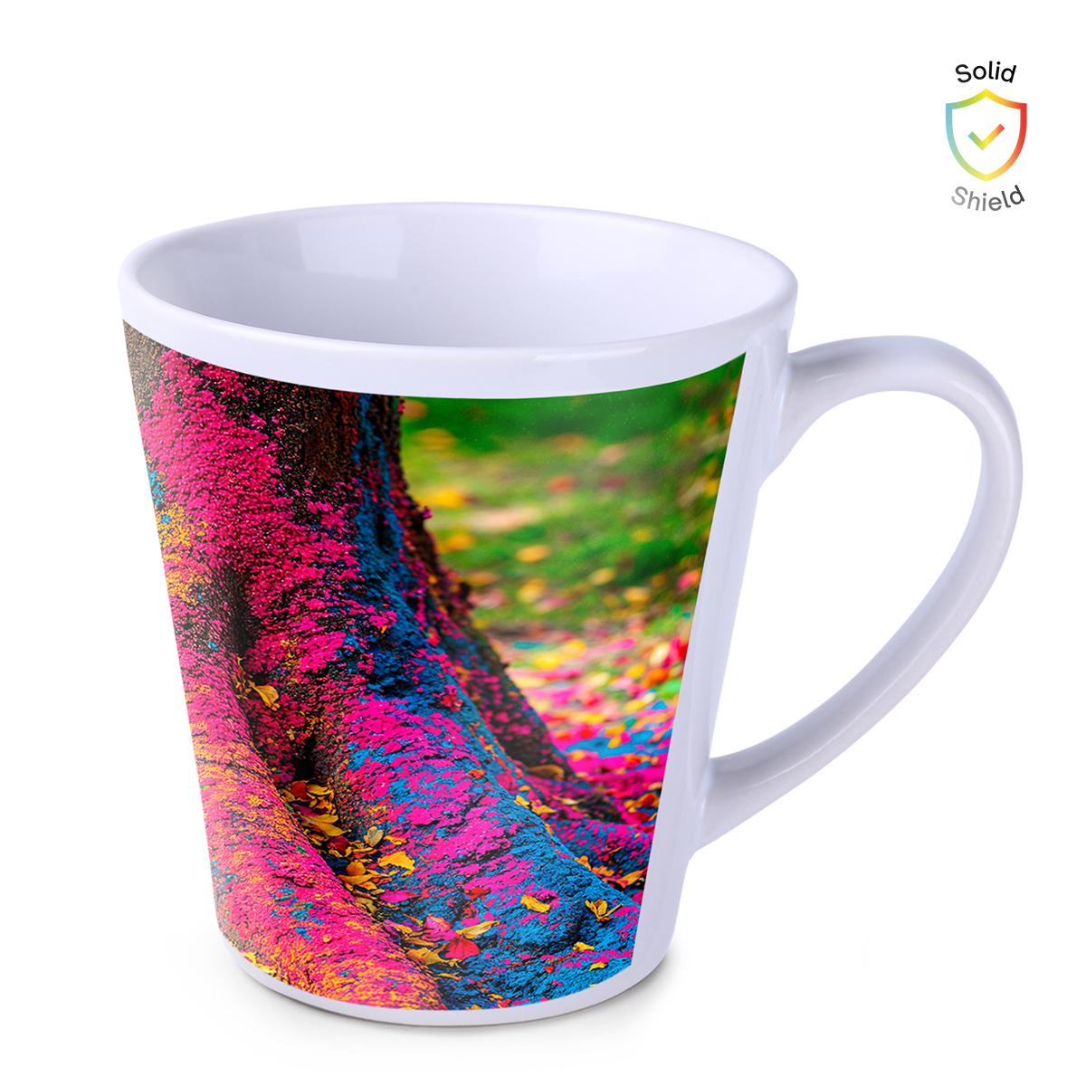 Tazza con forma conica. Questo modello è stato adattato per l'applicazione di stampe di alta qualità mediante la tecnologia Stampa Art.